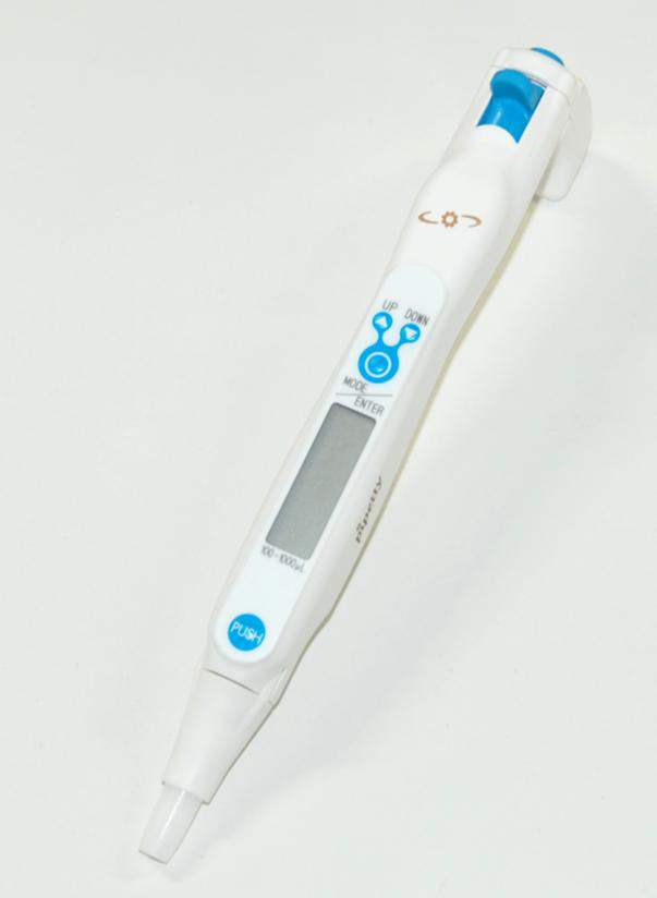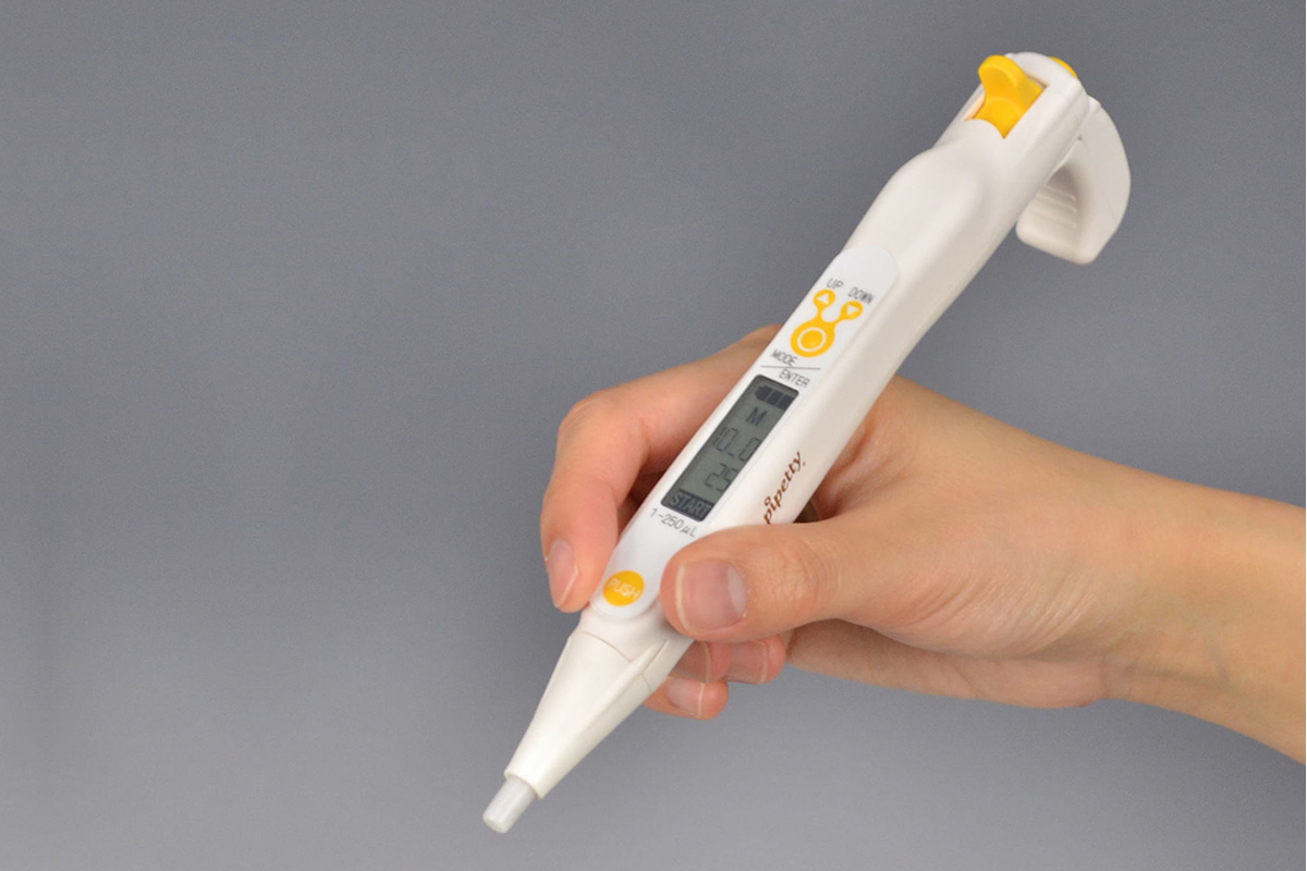 pipettyは、作業者の負担を減らす、軽量でコンパクトなペン型電動ピペットです。