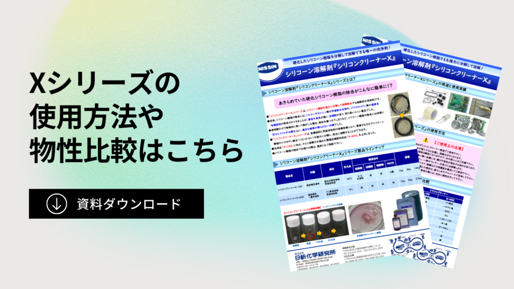 シリコーンゴムをシリコンクリーナーXに浸漬させる実験を行い、30分後には溶解して無くなったことを確認。