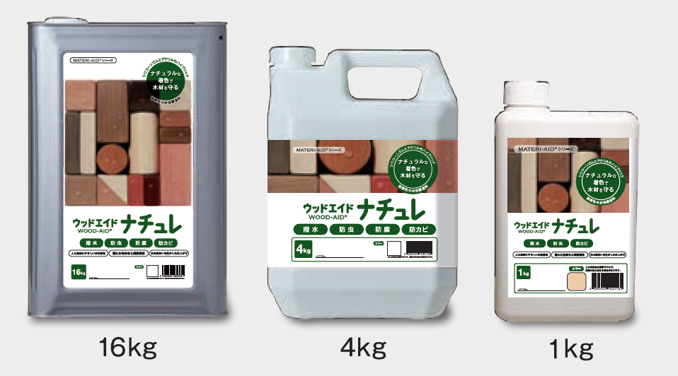 - ウッドエイドナチュレ:水性着色による超耐候性木材保護用(撥水・防虫・防腐・防カビ)