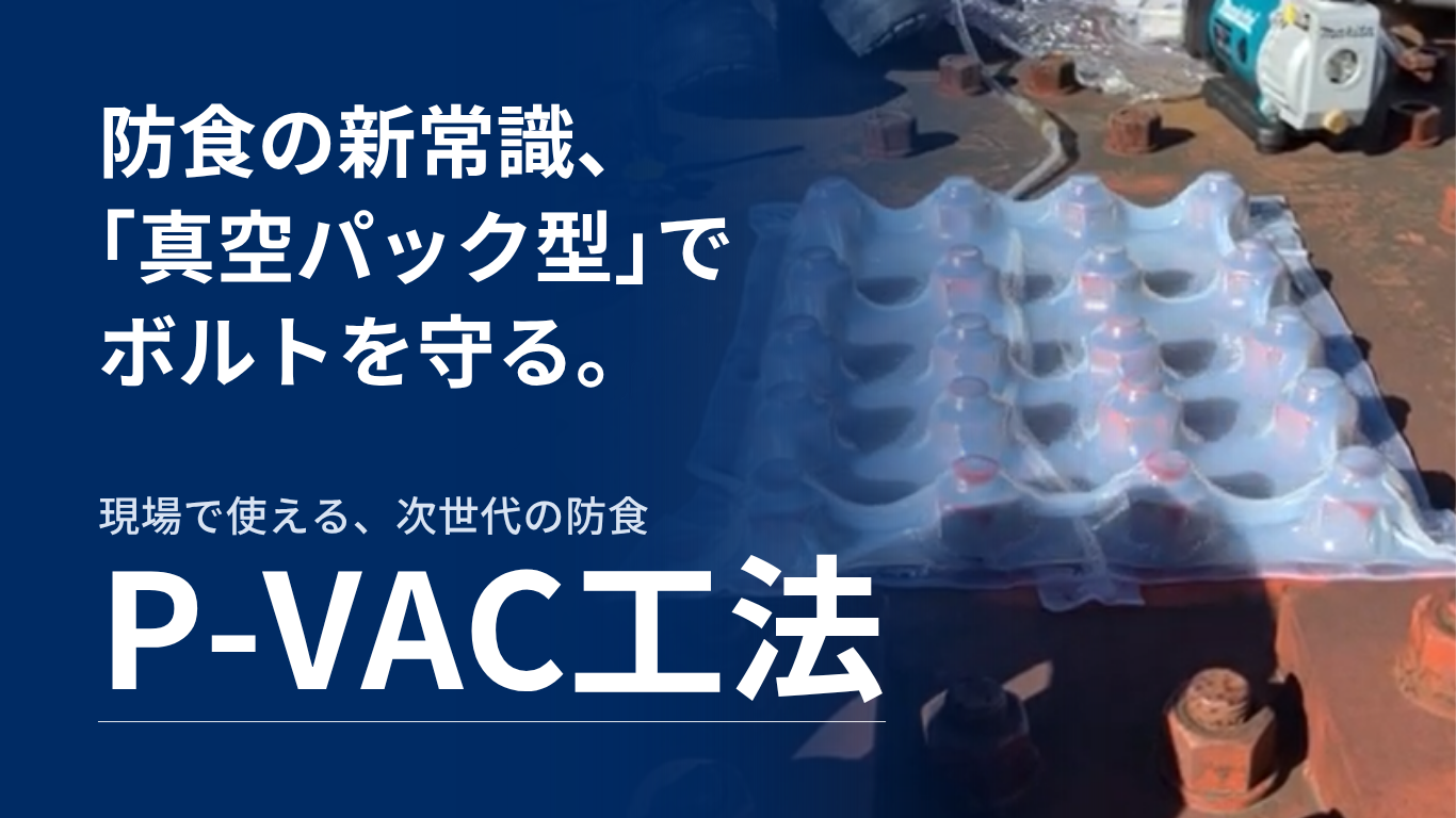 ボルトのサビ、瞬時にまとめて防食!“真空パック型”で実現する、あっという間の防食工法 P-VAC(ピーバック)工法は、信越ポリマー製「ポリマエース」を使用した真空密着型の防食技術です。外気・水分・塩分を遮断し、長期にわた […]