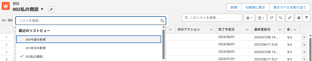 左上のリスト名の右にある▼をクリックし、「002私の商談」をクリックします。