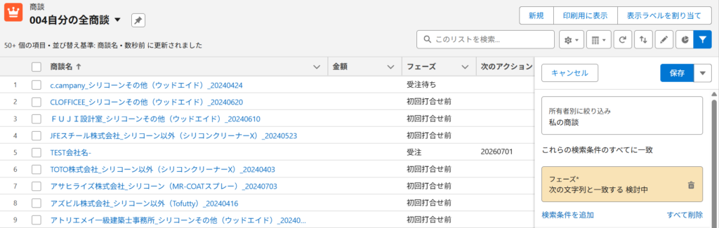 例:「私の商談」リストビューからフェーズが「検討中」の商談だけを絞り込み