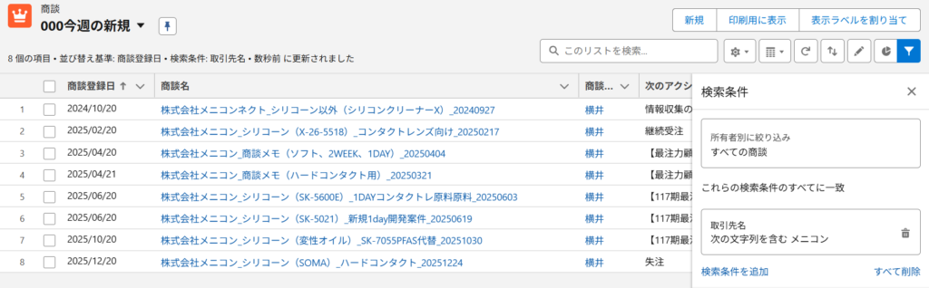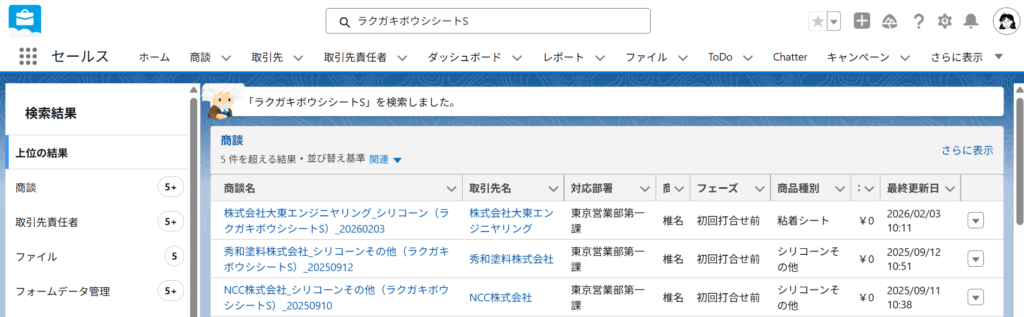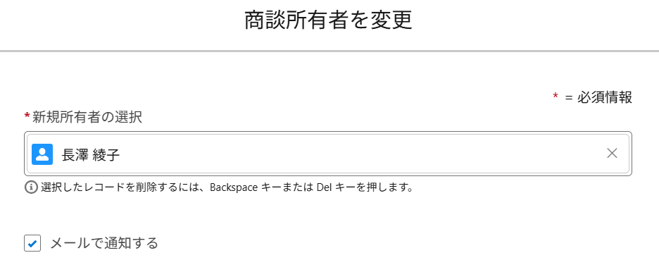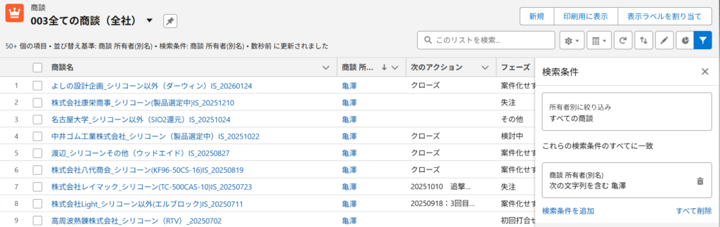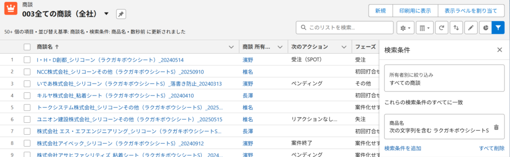 担当者ごとの案件を引き継ぐ場合は、担当者名(もしくは商談所有者名)で探します。